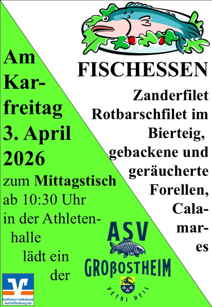 Auch 2026 wird wieder das beliebte “Fischessen am Karfreitag” in der Athletenhalle in Großostheim stattfinden. Angeboten werden wieder unsere schmackhaften Fischgerichte, wie sie auch auf dem Plakat aufgeführt sind. Aufgrund der sehr positiven Resonanz der letzten Veranstaltungen werden wieder 2 große Doppelfriteusen für die Pommes eingesetzt, was zu einer deutlichen Reduzierung der Wartezeiten geführt hat. Ob wir im Athletengarten Garnituren aufstellen können., entscheidet kurzfristig der Wettergott.